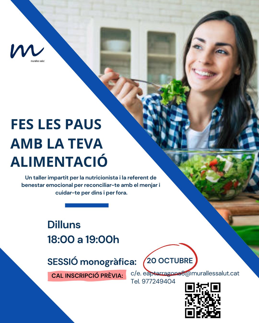 El proper dilluns 20 d’octubre a les 18 h, al CAP Muralles, t’oferim un espai per reconciliar-te amb el menjar i cuidar-te per dins i per fora.